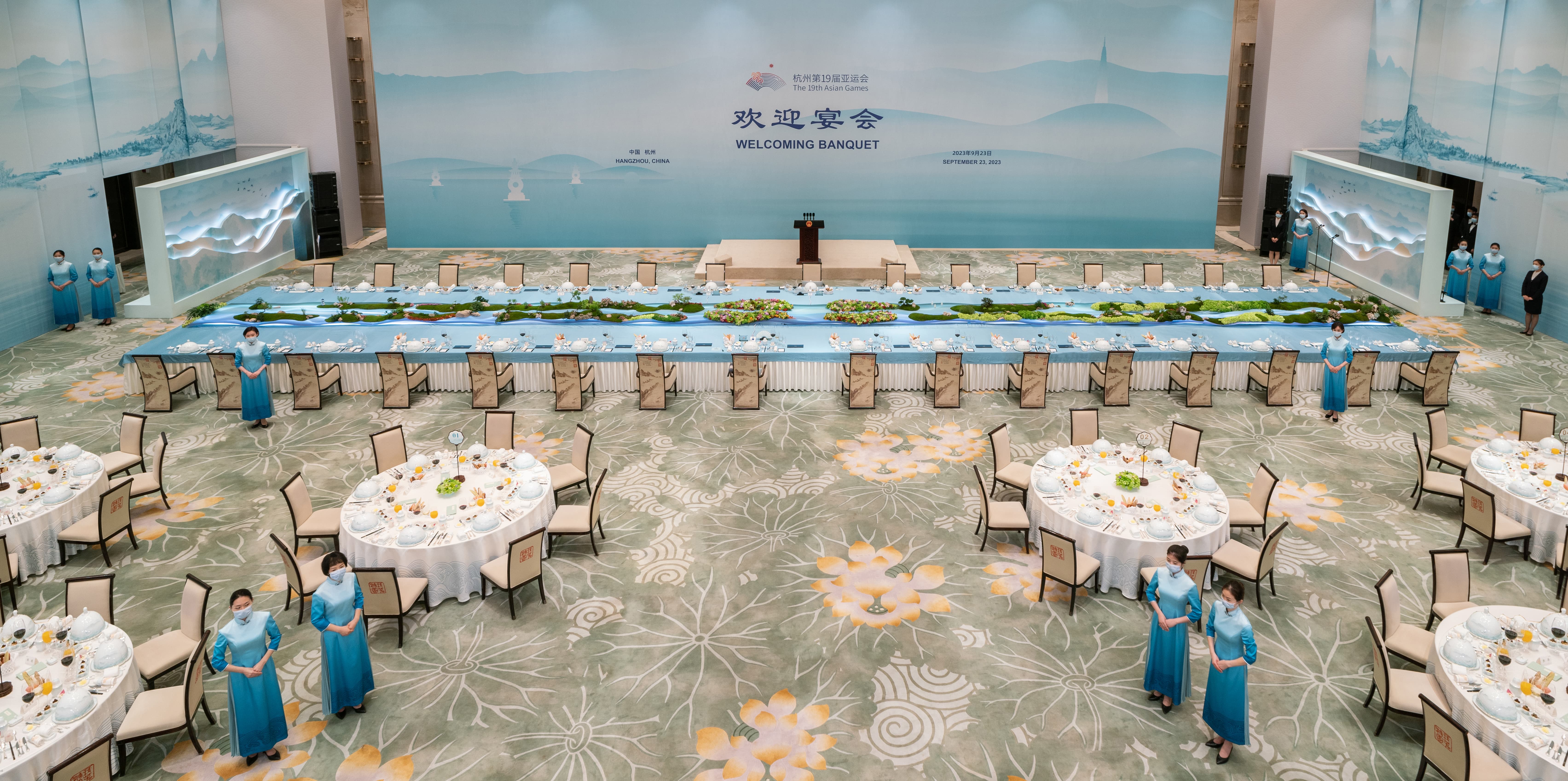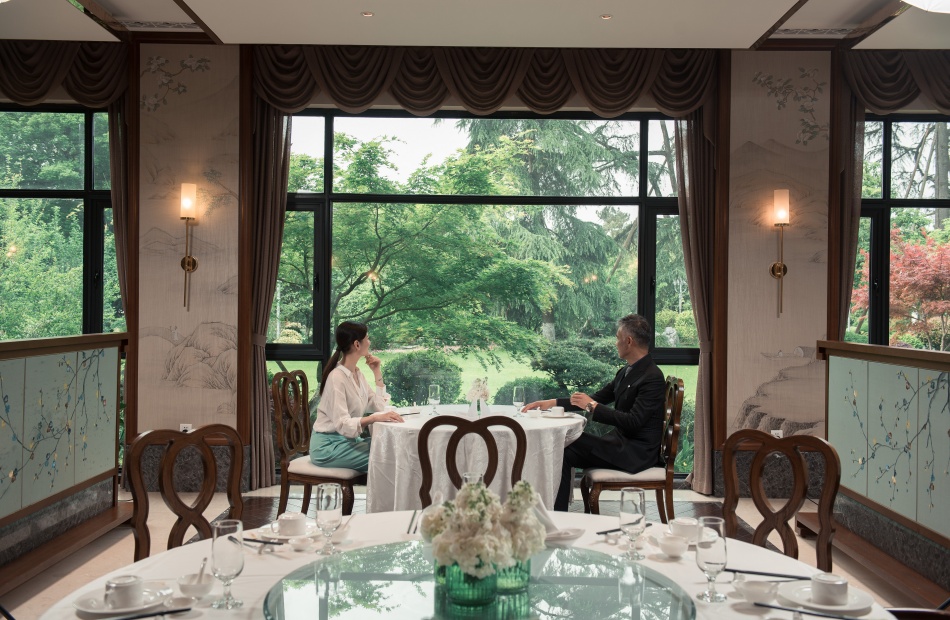 漪园宴会厅曾是G20杭州峰会欢迎晚宴的举办场所,室外园林移步易景,室内观赏一窗一景,巨幅真丝绸壁的《西湖全景图》与窗外西湖胜景相映成趣,建筑的内部装饰选用东阳木雕、青田石雕、安吉竹艺、铜雕等非物质文化遗产的浙江传统手工技艺,呈现完美的杭州元素与江南韵味。